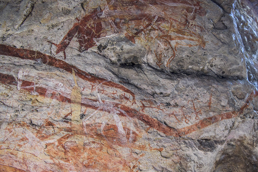 レフトハンド・クリークと呼ばれる川の近くの岩絵サイト。シェルターの天井画。長い蛇らしきものの間に小さな人間がたくさん描かれている。