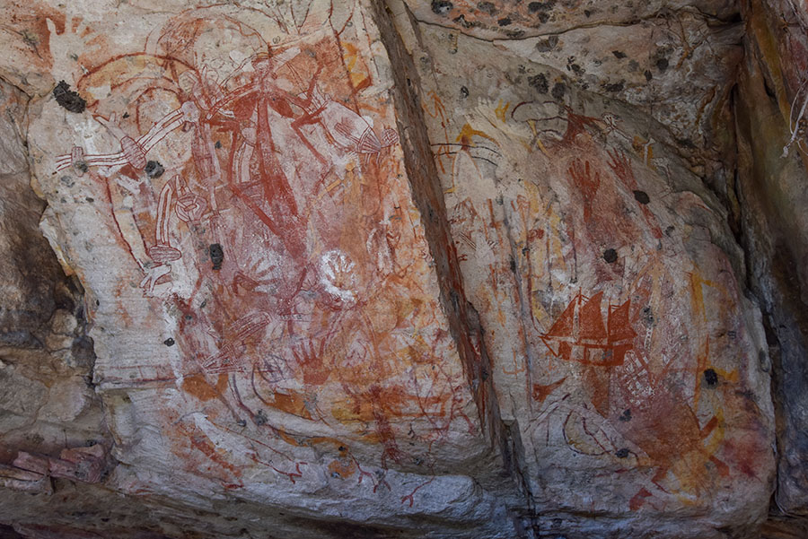 レフトハンド・クリークと呼ばれる川の近くの岩絵サイト。シェルターの壁面に描かれた絵。帆船の絵がある。