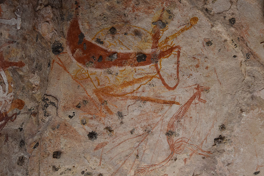 レフトハンド・クリークと呼ばれる川の近くの岩絵サイト。シェルターの壁面に描かれた絵。