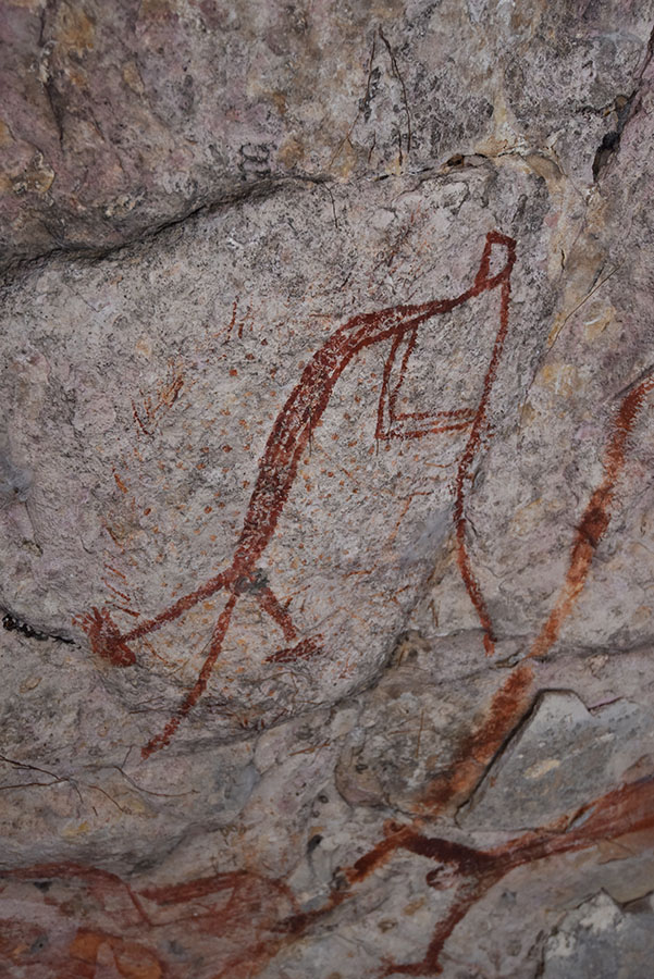レフトハンド・クリークと呼ばれる川の近くの岩絵サイト。シェルターの天井画。ディジェリドゥを吹く人物像。