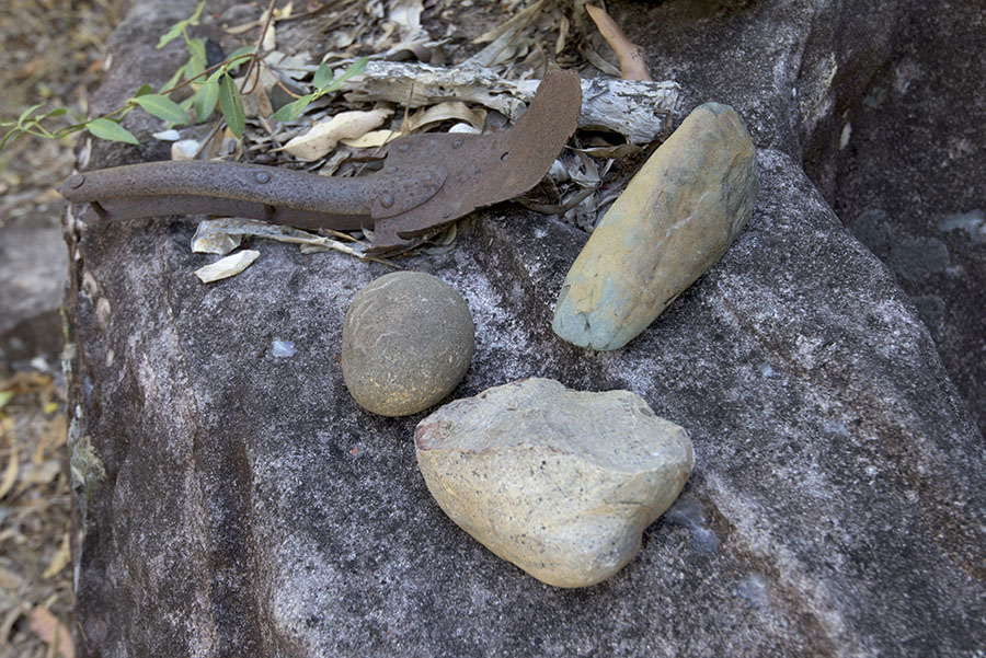 ブレイディー・クリークの低い場所にある岩絵スポットに残されていた石器と、鏃などに加工するために使われた鉄製のスコップ。