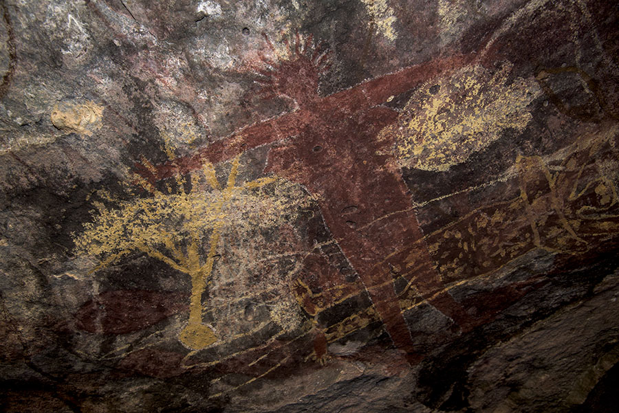 ブレイディー・クリークの岩絵スポットのひとつ「ハネムーン・コーナー」。左に木のようなものが描かれている。横向きになっている女性は体中に斑点が描かれている。天然痘のような病気を表しているのか。