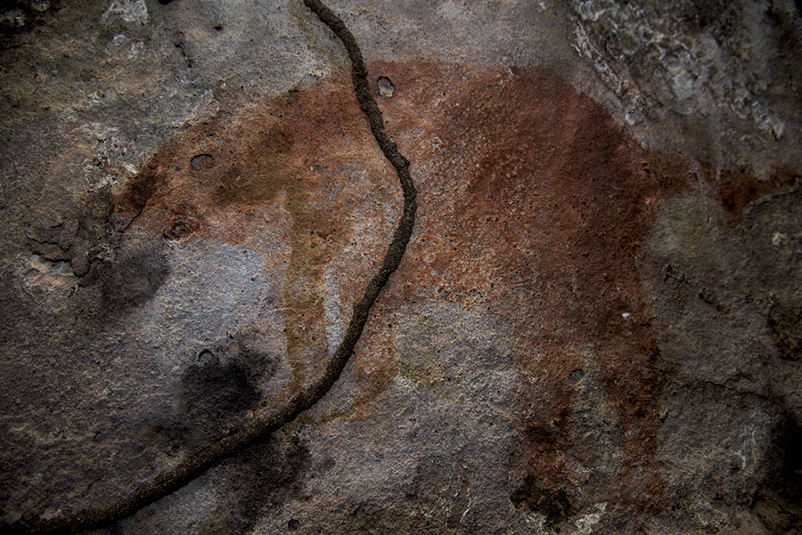 ブレイディー・クリークの岩絵スポットのひとつ「ハネムーン・コーナー」。非常に低いシェルターの天井に描かれた絵。岩ワラビーかウォンバット?