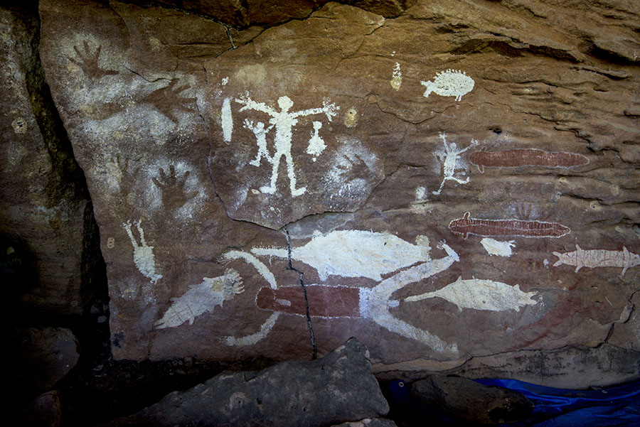 ブレイディー・クリークの最上部の岩絵サイト。ウナギ(赤く細長い絵)、ノコギリザメ、バラムンディなどのさなかと、泳いでいるように見える人物像。首からペンダントをかけている。