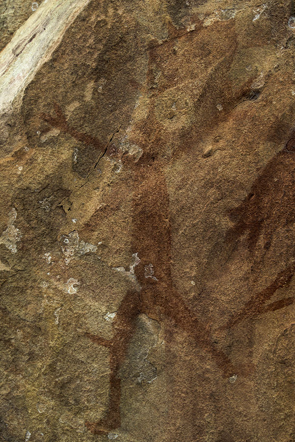 ブレイディー・クリークの低い場所にある岩絵スポットのひとつ「クロコダイル・ギャラリー」。 シェルターの天井画(前頁)のディテール。頭飾りをつけているように見える人物像。