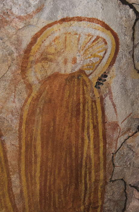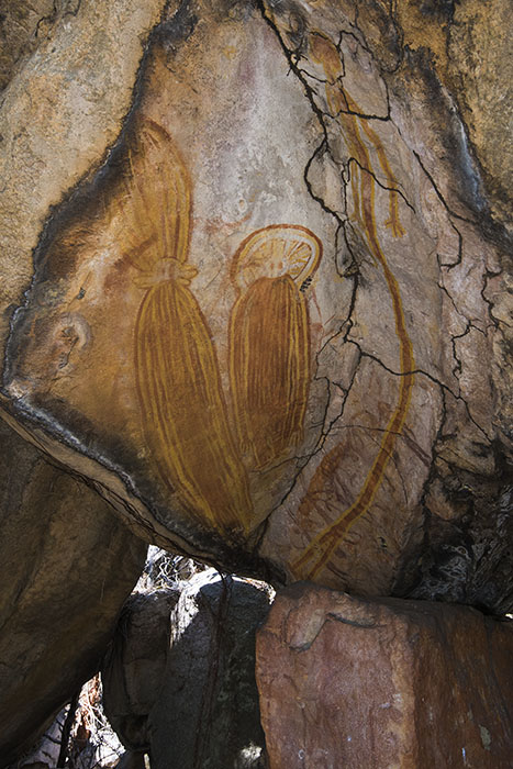 右側に描かれた細長い人物像はWadjuwaと呼ばれる"Spirit Man"であり、二人のフクロウ・ワンジーナとともにここに旅してきたのだと。