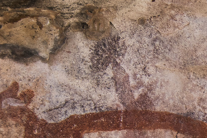 この人物像の頭の端の上に作られた蜂の巣を年代測定したところ、18000年前という結果が出、下にある絵はもっと古いと判断されたと言われている。