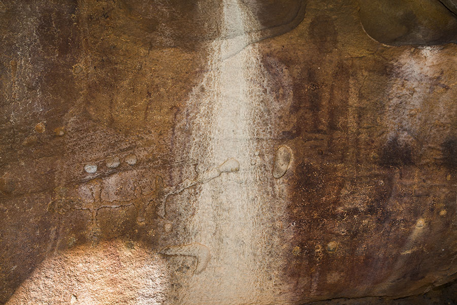 壁面のセンター部分。石彫と、人物像が描かれている。人物の手先はエミューの足になっており、エミュー・ドリーミングの祖霊像と考えられている。