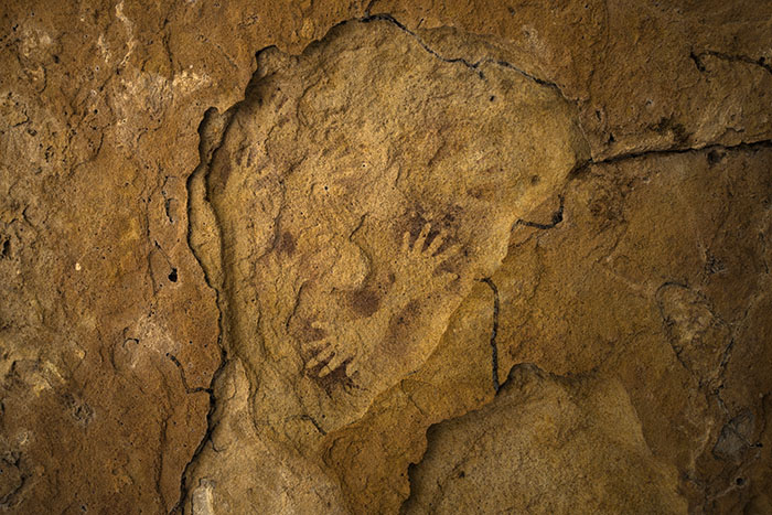 小さなシェルターの天井にある手形。