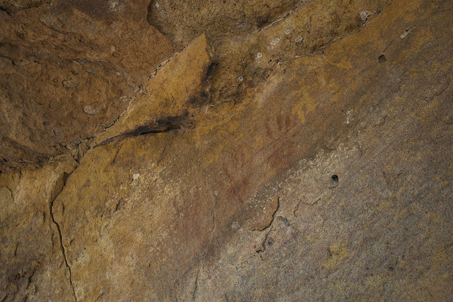 小さなシェルターの天井にある手型。ステンシル(ネガティブ)ではなく、文字通りの手型
