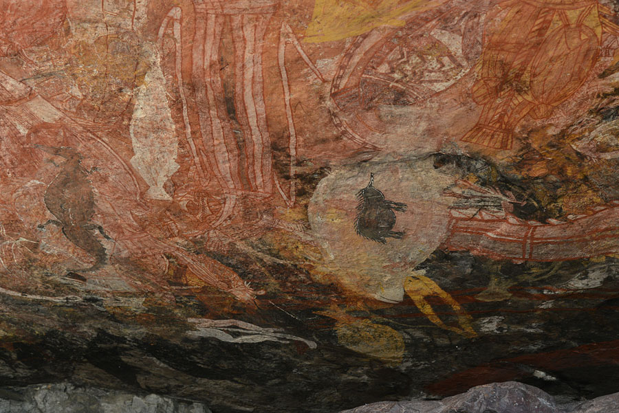 インジャラク・ヒルの最も大きなシェルター の天井に描かれた絵。中央に描かれたヤマアラシ、左端のワニは、比較的新しいもののようだ。