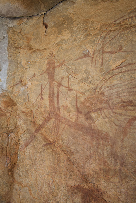 マーテンス川の下流、ミッチェル川に合流する場所に近い岩絵サイト。左から右へ、横向きになった小さな人物像が見える。泳いでいるようにも見える。