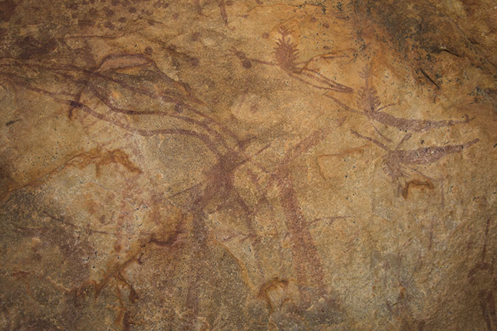 マーテンス川の下流、ミッチェル川に合流する場所に近い岩絵サイト。これも槍を投げた後の姿だろうか。頭に房状の飾りをつけている。