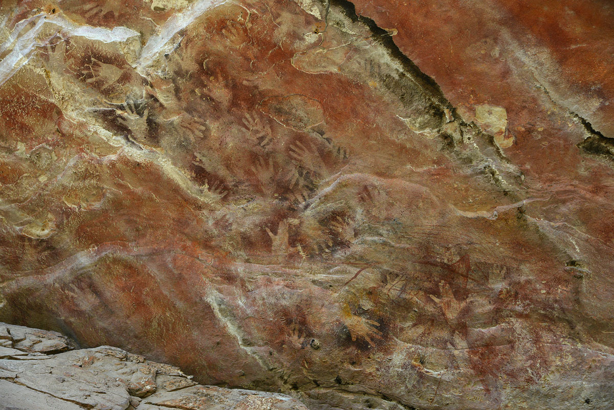 シェルターの天井に描かれた「ネガティブハンド」。岩に手を押し付け、染料を口で吹きかけて描いている。