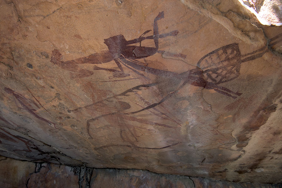シェルター左端の低い天井に描かれた人物像。大きな投槍器をつけた槍を投げる人物像と頭飾りを付けた人物像が重なっている。