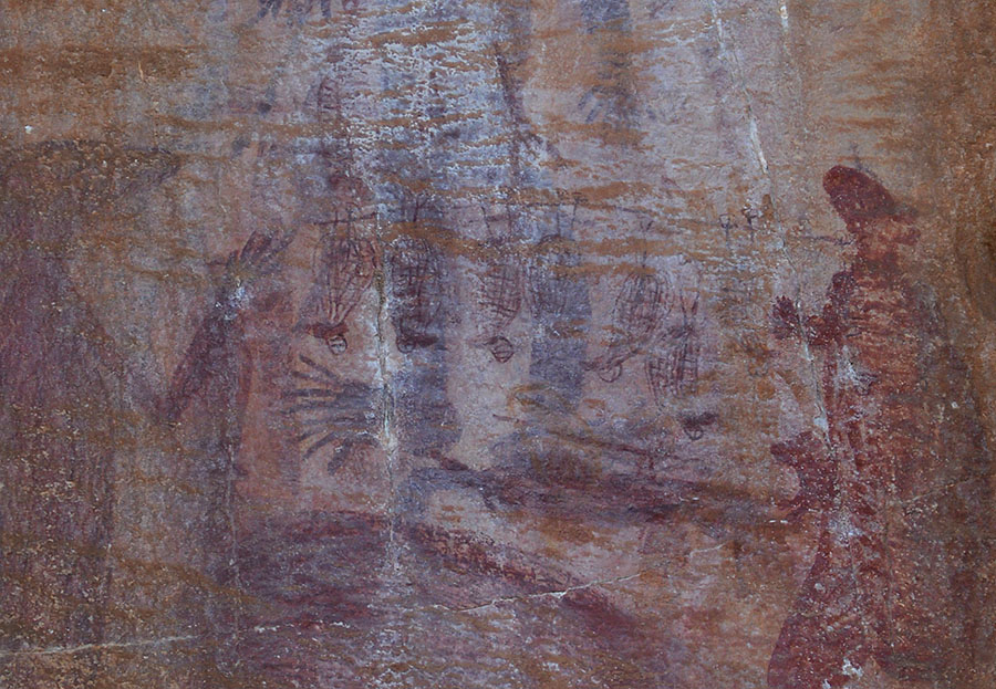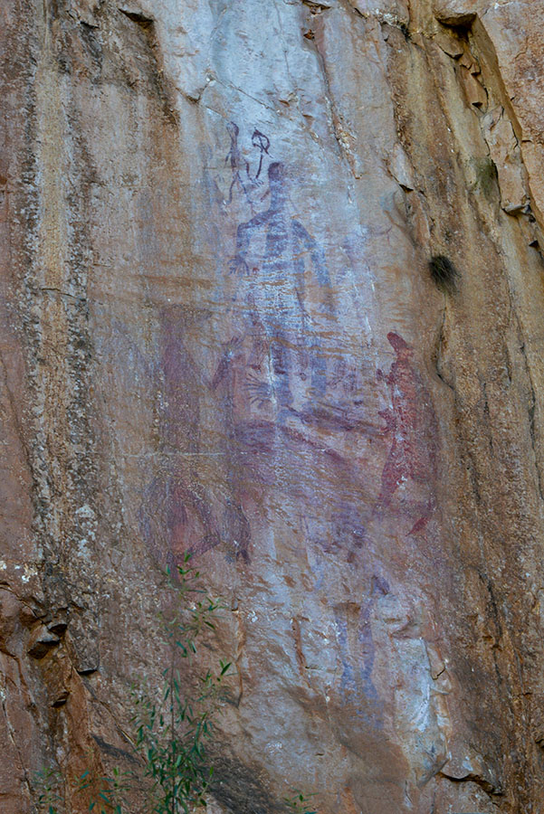 キャサリン渓谷に残る岩絵。かなり擦れているが、人物像、精霊像らしきもの、ワラビーなどが見える。細い線画でコウモリ(フライング・フォックス)の姿も。