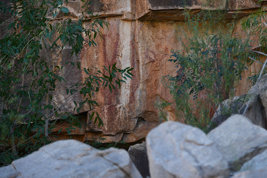 キャサリン渓谷に残る岩絵。逆さに描かれた人物像は、空から降りてきた祖霊像か。