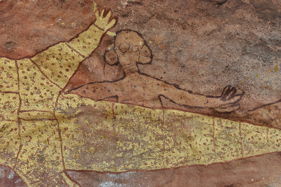 クィンカン・ギャラリーのメインパネルの右側のシェルター。ワニの下に描かれたティマラ像。