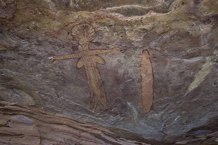 レッド・ブラフ。シェルターの横の壁面。頭飾りをつけた女性像とウナギ。