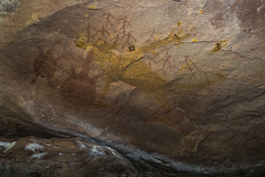 サンディー・クリーク。シェルターの天井の絵。首の長いヘビガメが見える。大きな黄色い人物像とたくさんの小さな人型