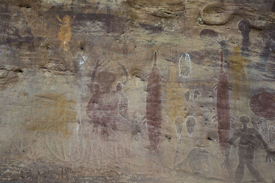 Split Rockのメインパネル中心部拡大。赤い細長いものはおそらくノコギリザメ。その間にあるのは上から人の足跡、カンガルーの足跡。