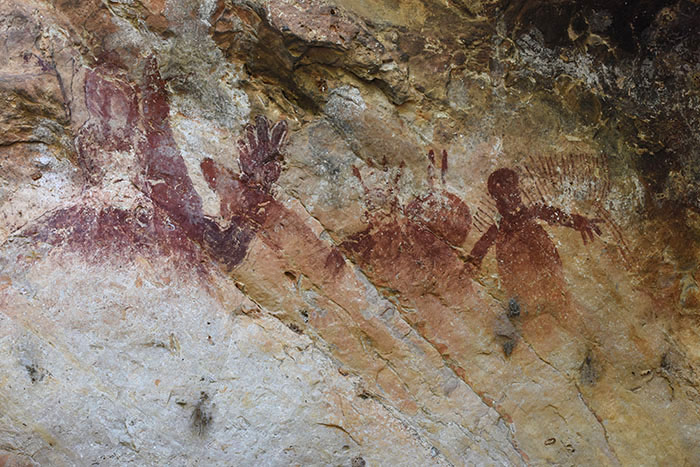 トンネル・クリークの岩絵。大小いくつかの人物像。頭に触覚のような装飾をつけているようにみえる。左側には逆さになった人物像の一部が見える。