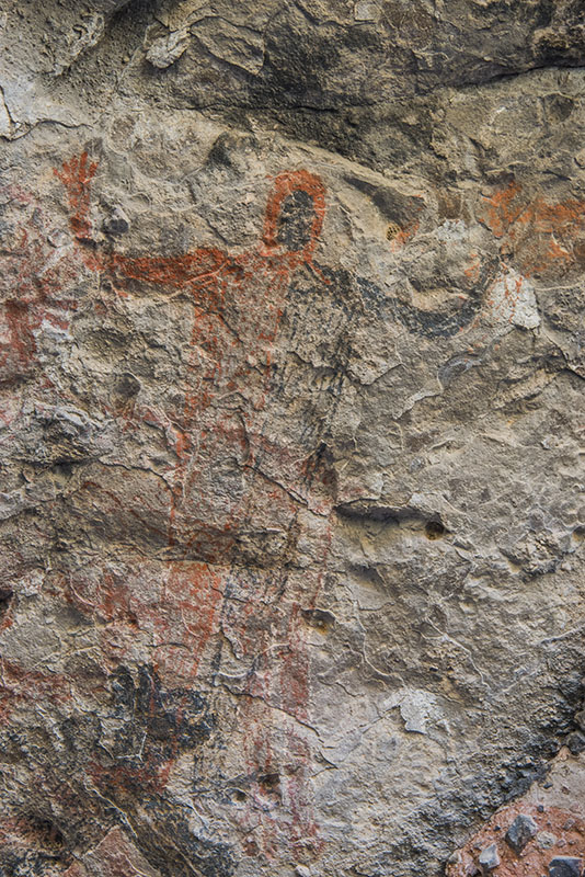 クエバ・デル・ラトンのユニークな人物像。赤と黒の半々に塗り分けられている人物像はこの地域のひとつの標準だが、顔が黒く、体に細い縦縞が入っているのは珍しい。