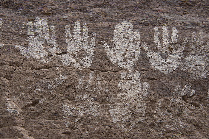 ラ・トリニダードの岩絵。壁面のかなり高い場所に押された手形。こどもの手形だけが押された場所は珍しい。イニシエーションに関連したものとしてはかなり小さい。