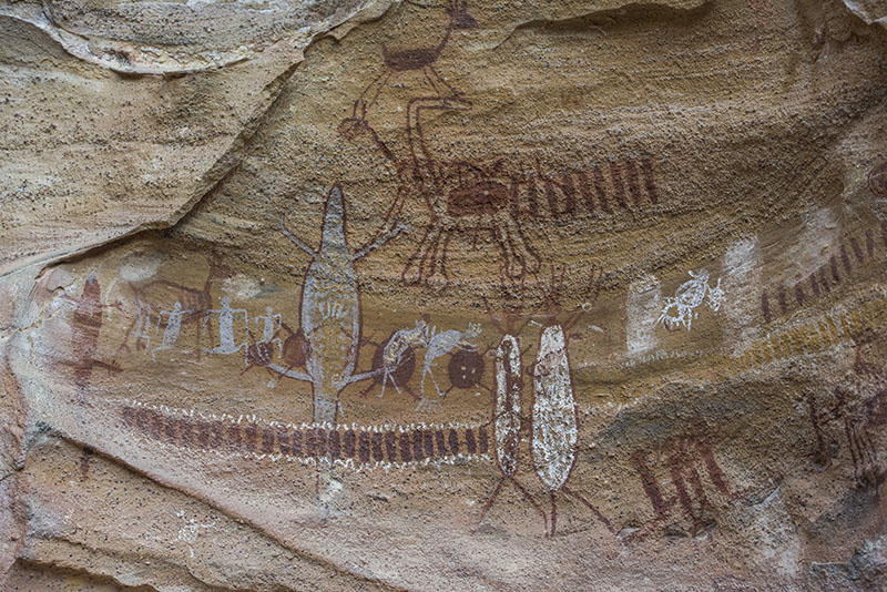 非常に保存状態の良い絵。年代は12000年前まで遡る。白い虫のような姿、その左に小さく並んでいるものは、体に蓑などを巻いた装束をしている男たちと考えられている。