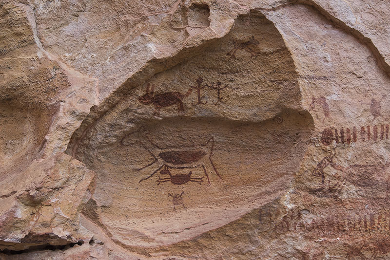 岩壁には大きな岩塊が転がり落ちた後のスムースな面をもつ窪みがあり、そうした部分に絵が描かれることも多い。中央の鹿の絵は公園のシンボルマークにもなっている。