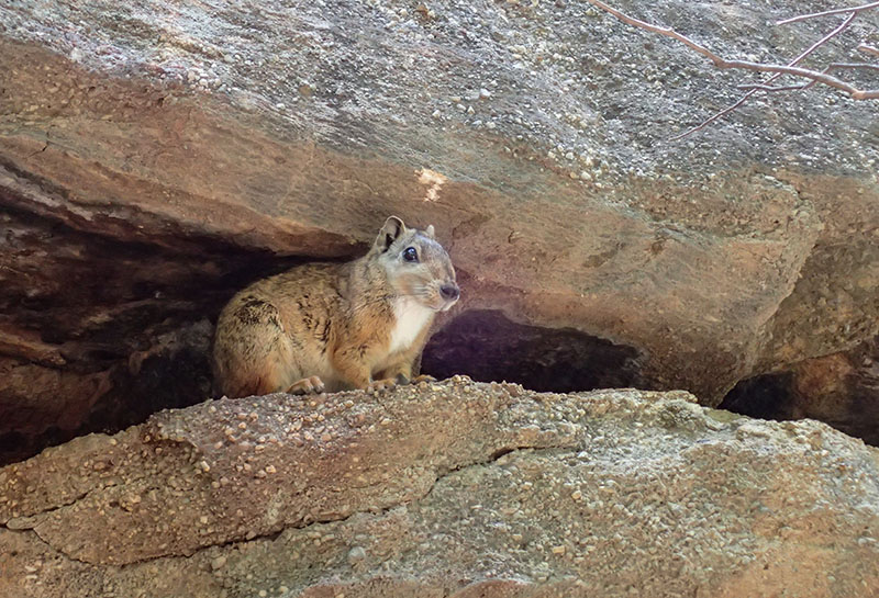 公園内に多く棲んでいるモッコという齧歯類。岩の隙間に棲み、糞尿が岩絵に大きなダメージを与えるため、岩絵のある場所にモッコが棲まないように工夫されている。