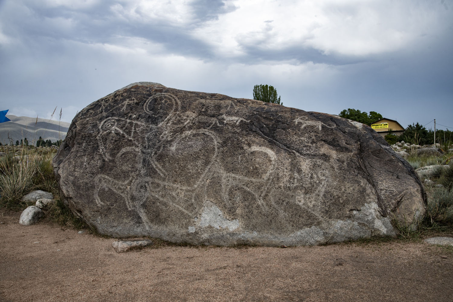 「ペトログリフ博物館」。イシク・クル湖北岸沿いにある野外博物館。敷地内に絵が刻まれた岩や埋葬地が点在している。おそらくほとんどは元からその場所にあったものと思われる。