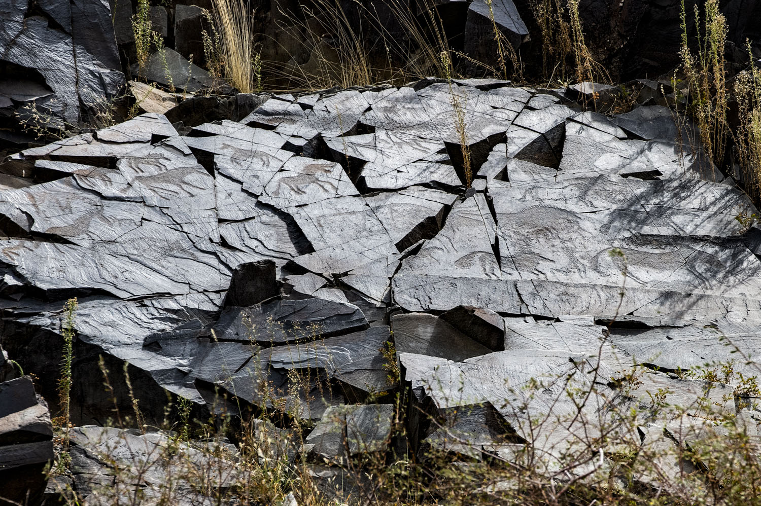 タンバリ。グループ IIの壁画。 全体に直線的な亀裂が入っていて、崩落の危機にある。青銅器時代の壁画。