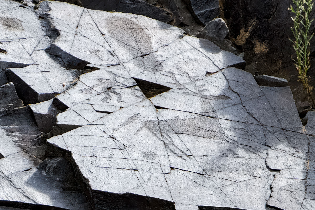 タンバリ。グループ IIの壁画。 前頁のパネルの右上部分。大きな足跡(サンダル?)、射手(動物の仮面をつけていると考えられている)と鹿。