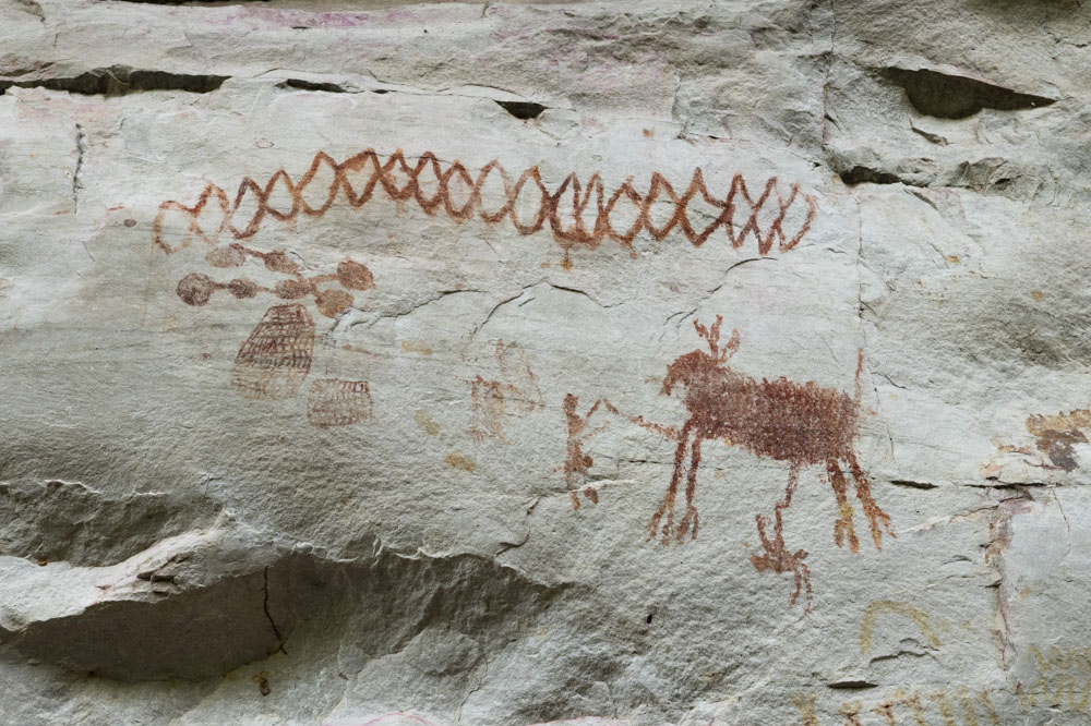 セロ・アズール(青い山)のエル・マス・ラルゴ・パネル。右下は槍を持った人物が大きな鹿を突いているように見える。