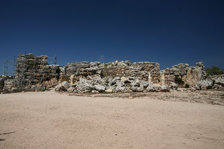 ゴゾ島に残るジガンティーヤ神殿もマルタの巨石文化を代表する遺跡のひとつ。建造年代はマルタの巨石文化最初期で、最も古い痕跡は紀元前4000年頃まで遡るともみられているが、主要部分の建造は紀元前3500年頃から3000年頃とみられており、この年代をジガンティーヤ期とも呼ぶ。大小二つの神殿が並ぶ構造で、それぞれが五葉のクローバー状に分かれた部屋をもっている。全体に損傷が激しい。 |