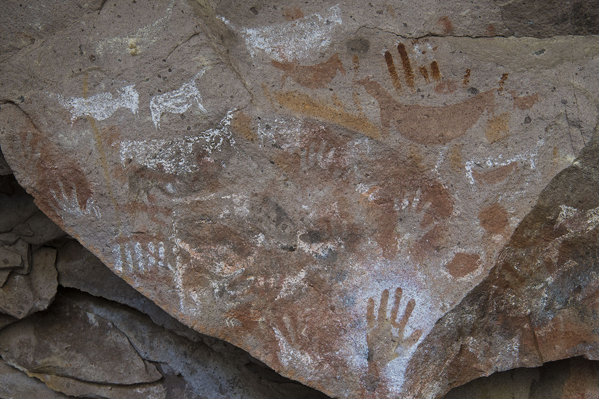 アレーロ・チャルカマタ。この場所に描かれるグァナコはクエバ・デ・ラス・マノスのそれと比べて動きが無い。妊娠しているように見えるものも少なくない。天候不順などで野生動物が少なくなった時代に多産を願って描いたものではないかという仮説もある。