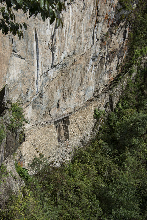 インカ道にかかるインカ橋。丸太を渡した簡単な造りで、外敵の侵入を防ぐために落とせるようになっている。現在は通行禁止。
