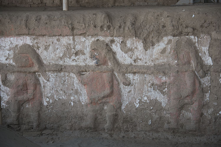 モチェ王国の「月の神殿」の壁面のレリーフ。生け贄に引き立てられていく人たちの姿とみられている。 近年発掘された生け贄の遺骨の分析で、戦争捕虜を生け贄に供していた可能性が高いとみられている。