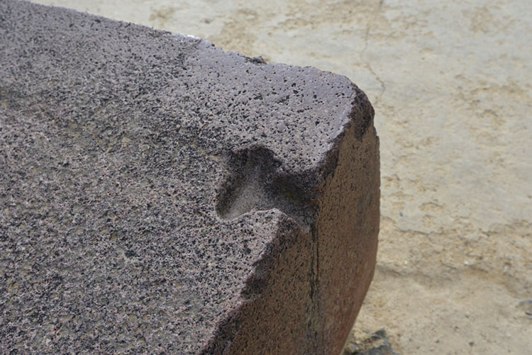 オリャンタイタンボ遺跡。放置された石材に残る、接続用の金具を入れるための溝。