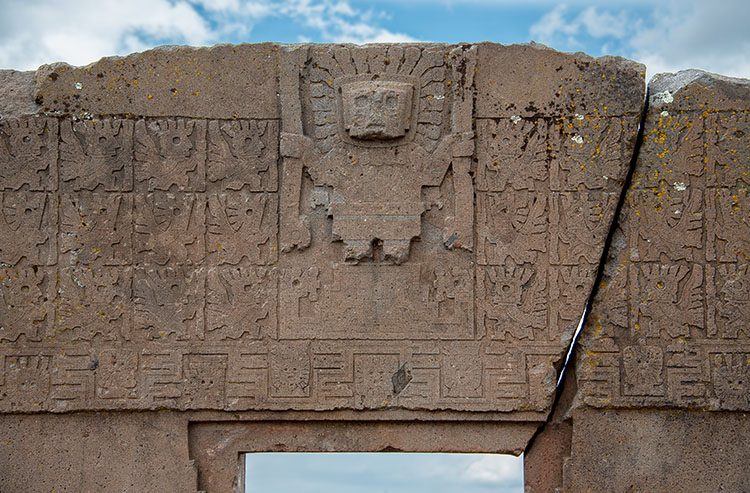 「太陽の門」上部のレリーフ。両手に杓を持った人物像はアンデス文明に登場する造物主ヴィラコチャであるとか、 アイマラ語圏の神話的英雄トゥヌパであるとも言われている。両側には羽が生え、やはり杓のようなものを持ったキャラクターが計30ほど描かれている。