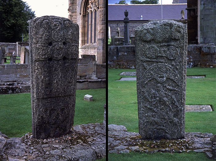 現在教会の廃墟内に設置されているこの石碑は1823年に聖ジャイルズ教会近くの道路の補修中に発見されたという。上部と基部が欠けている。シンボルが彫られた面の最上部の絵柄は不明。その下にダブル・ディスクとZ棒、下に三日月とV字棒、その下には馬に乗った人物と猟犬による狩りの情景が掘られている。教会は史跡保存のためフェンスで囲まれ入場が管理されているので、見学時間外は見ることができない。