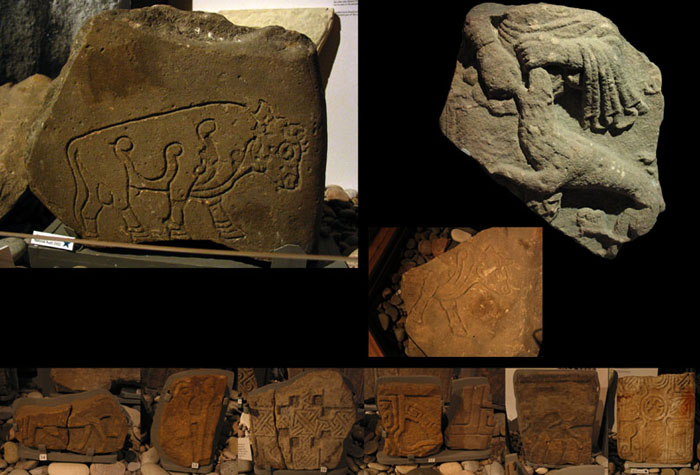 この博物館には完全な形のピクトの石碑は無い。ピクトの石碑や古いクロスの断片があるだけだが、Burgheadの雄牛の石がある(左上と右中央)。うちひとつは半分しか残っていない。かつて膨大な数の石板が発見されたという記録があるが、現在残っているのは6つだけで、ここにあるのはそのうちの2つ。足の付け根に先の丸い縁取り模様のある、『ケルズの書』にも使われている独特な様式で描かれている。