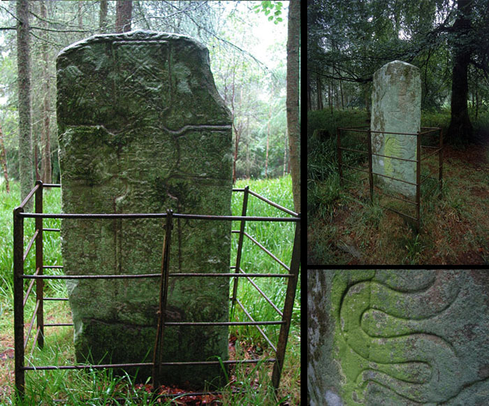 Glamisの町から出て国道をほんの少し東に走ると森に入る細い道がある。しばらく歩くと木々に中にあるのが、この石碑だ。かなり摩耗が激しい。十字架はGlamis Manseのものと似た様式だ。表にはトリプル・ディスク、花があり、裏面には獅子のような動物、ヘビ、鏡がある。元はこちらの面だけのクラス1の石碑であったものが、クラス2の石碑として作りなおされたらしい。