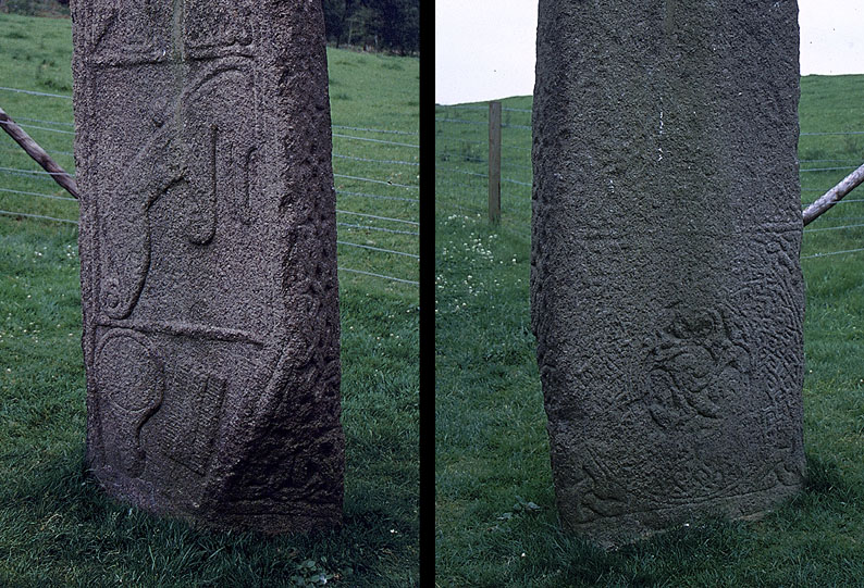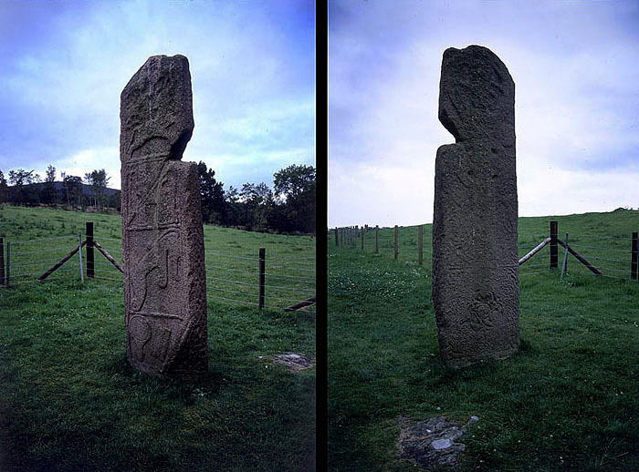| Drumdurnoにあるこの石の名は悪魔にだまされて石に変えられた娘の伝説に由来するという。かなり風化が進んでいて、クロスが彫られた面は特に傷みが激しい。クロスの上には一対の海獣と間に人間の像がある。シンボルが彫られた面も最上部の絵柄はよくわからないがケンタウルスのような馬人が描かれている。その下に二股に分かれた方形にZ棒、「ゾウ」、鏡とクシとなっている。最下部が一部斜めに切ってあり、組み紐紋様が彫り込まれているという、ピクトの石碑としては少し変わった形をしている。風化が激しいがかつてはかなり美麗な石碑だったに違いない。 |