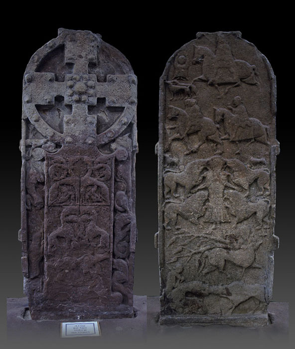 | 博物館の中央にひときわ大きく目立つこの石碑はクラス3の石碑だ。2.5メートルある。ピクトのシンボルは無い。表の十字架は他にあまり見られない様式で、金属製の十字架を模したような様式に見える。宝石が埋めてあるかのような突起がある。クロスの下には三対の動物像があり、左右には尻尾や舌をかれませている動物組み紐のような様式のレリーフがある。裏面は最上部は長い外套をまとったピクトの騎馬像で、犬が二匹と天使が描かれている。その下は三人の騎士に導かれる騎馬像で、鞍に大きな布がかけてあることから位の高い人物であることを伺わせる。その下は旧約聖書の一場面でライオンの巣穴にいるダニエル像。その下には両手に斧を持った馬人像で、Glamis Manseの絵と同じだs。さらに下には牛の頭部に食らいつく怪物のような生きもの。その後ろに棒をもったピクトの姿がある。 |