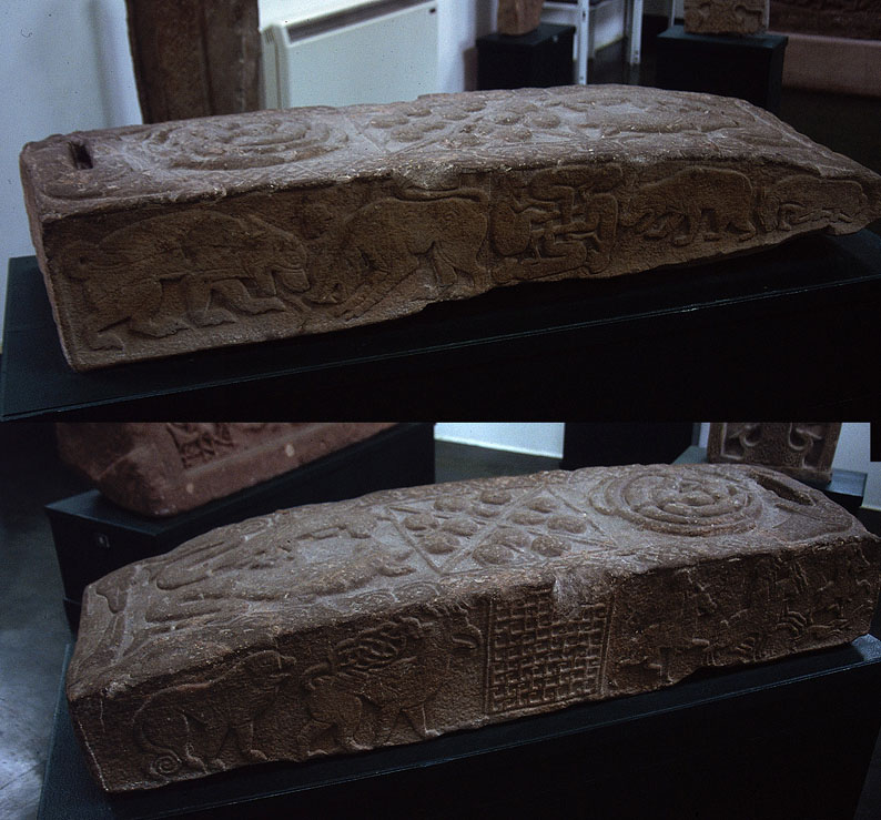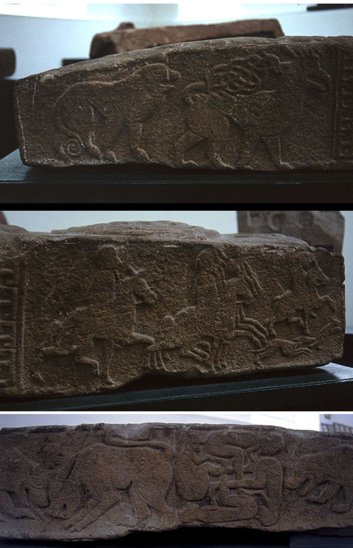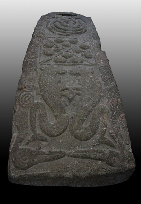 | この墓石は非常に興味深い彫刻で覆われている。上部は三匹の蛇がからみ合ってとぐろを巻いており、その下の12個の突起もよく見るとひとつずつ蛇が巻いている。一対のタツノオトシゴがいて、全体を片側が鳥の頭、反対が口を開けた動物の頭になった組み紐文様で囲まれている。側面も非常にユニーク(下の画像)で、中でも人間が四人組合わさって卍模様のようになっているパターンは他に見られないものだ。その人間卍の左には人の死骸をむさぼる動物が一対描かれている。 |