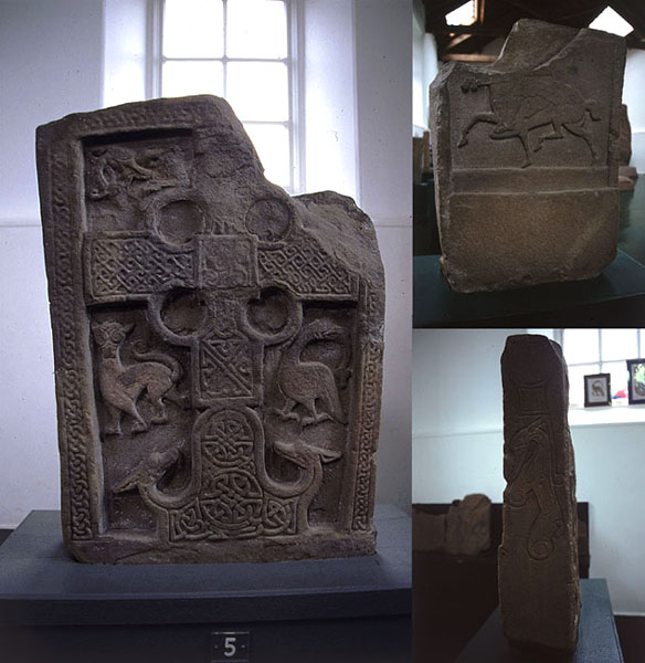 これはとても珍しい形のクラス2の石碑だ。十字架も下部に台座のようなものがあり、両脇に動物の頭が見える。十字の横腕の下には怪物が描かれている。左は目の大きな尻尾がとぐろを巻いた動物、右は蛇を加える猛禽類のようだ。裏面は騎馬像だが、欠けている。馬の尾が切られているようだ。側面にピクトのシンボル「鏡ケース」と「ゾウ」がある。