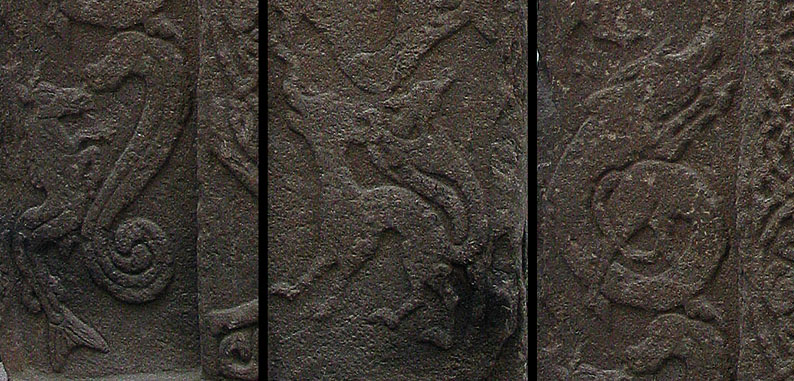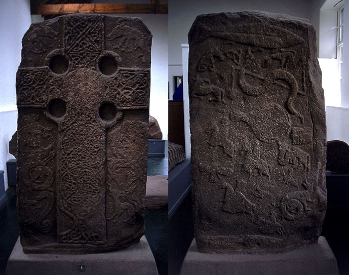 | 最も初期のクラス2の石碑ではないかと言われている。青銅器時代のスタンディング・ストーンを加工しなおしたもので、下部にふるい線刻が残っている。十字はアイリッシュ・スタイルで組み紐文様で埋めてあるが、周囲は奇妙な想像上の生きもので囲まれている。裏面はピクトのシンボルなどがかなり乱雑に彫られている。サケ、犬の頭、「ゾウ」、蛇にZ字棒、鏡にクシがある。クシの下にはヒザをついたラクダのような動物も描かれており、興味深い。 |