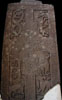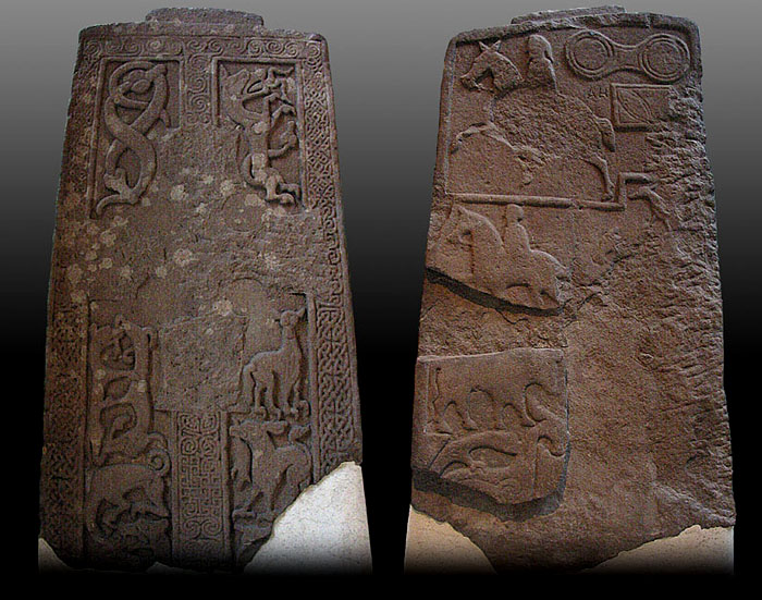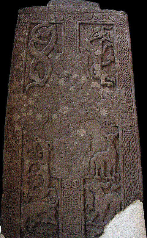 これもなかなか見事な石碑だったのだろうが、十字架はすっかり削り取られていて、裏面もかなりの部分が失われている。十字の周囲にはピクト人お得意の弱肉強食の野生の世界が描かれ、左上には互いに尻尾をかみ合う蛇の姿が印象的だ。裏側の右上にダブル・ディスク、その下に四角いマークが見える。